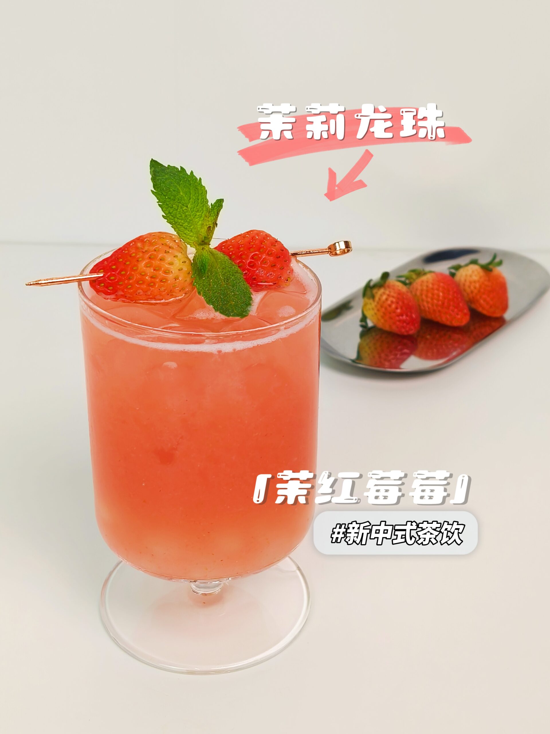 Step 5: Place 40g of tapioca pearls (also known as "dragon pearls" or "bubble tea pearls") and 100g of ice cubes into the glass, pour the beverage over them, and finally garnish with strawberry chunks and mint leaves. Enjoy your refreshing Strawberry Dragon Pearl Jasmine Green Tea.